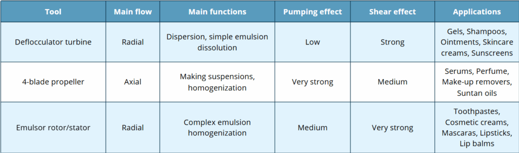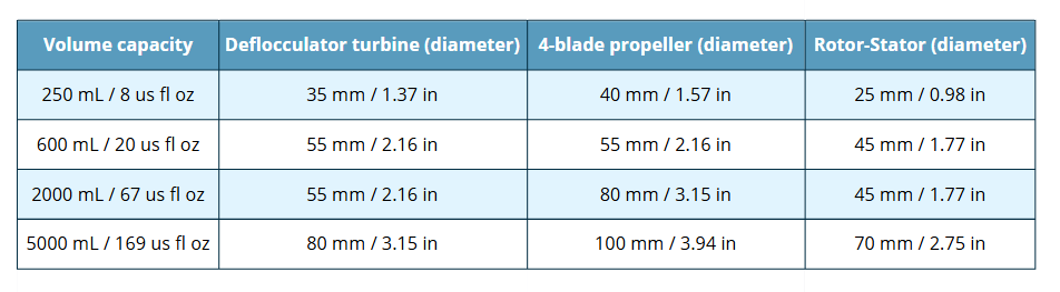 | • 440 W DC motor • Power: 0.4 kW • Voltage: 110/220V – 60/50Hz (may vary depending on the electrical voltage of the country of delivery) • Supplied with a plug — plug type must be specified at the time of order confirmation | • 2006/42/CE directive • Operation prohibited if the agitator is in high position • Operation prohibited if running without beaker • Start-up at 50 rpm • Emergency stop During operation: • The turbine must be completely in the beaker • Do not use any utensil in the beaker while the tool is rotating • Do not put your hands in the beaker or touch the rotating parts • Do not hold the beaker in suspension during agitation | • Wide range of tools for agitation and mixing (turbines, propellers, emulsifier rotor/stator) • Removable splash guard • Support to remove the turbines • Collapsible protective sleeve • Stainless steel shaft and turbines |